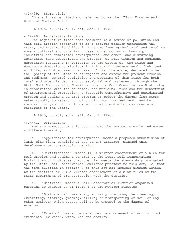 The act establishes a statewide program to reduce the impacts of soil erosion and sediment deposition on New Jersey’s environment and infrastructure. It focuses on managing stormwater runoff, mitigating nonpoint pollution, and conserving vital land and water resources. Through coordinated efforts by the State Soil Conservation Committee, local Soil Conservation Districts, and other government agencies, the act ensures that development activities adhere to erosion and sediment control standards.